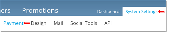 5. Aktivacija in konfiguracija Moneta ECWID modula V spletni trgovini ECWID izberite meni zgoraj desno "System Settings" in nato podmeni "Payment", kot je prikazano na sliki 1.